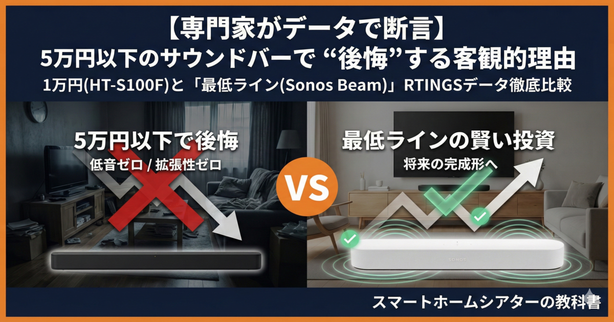 【専門家がデータで断言】5万円以下のサウンドバーで“後悔”する客観的理由。3万円・1万円モデル(SONY HT-S100F等)と「最低ライン(Sonos Beam)」をRTINGSデータで徹底比較。
