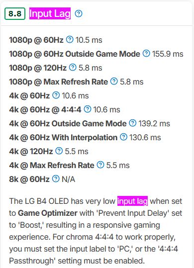 ‘1080p @ 120Hz’‘4k @ 120Hz’ といった項目に注目してください。近年のハイエンド有機ELテレビ(例:LG G5, SONY A95L, LG B4など)は、この数値が軒並み 10ms(0.01秒) を下回っています。