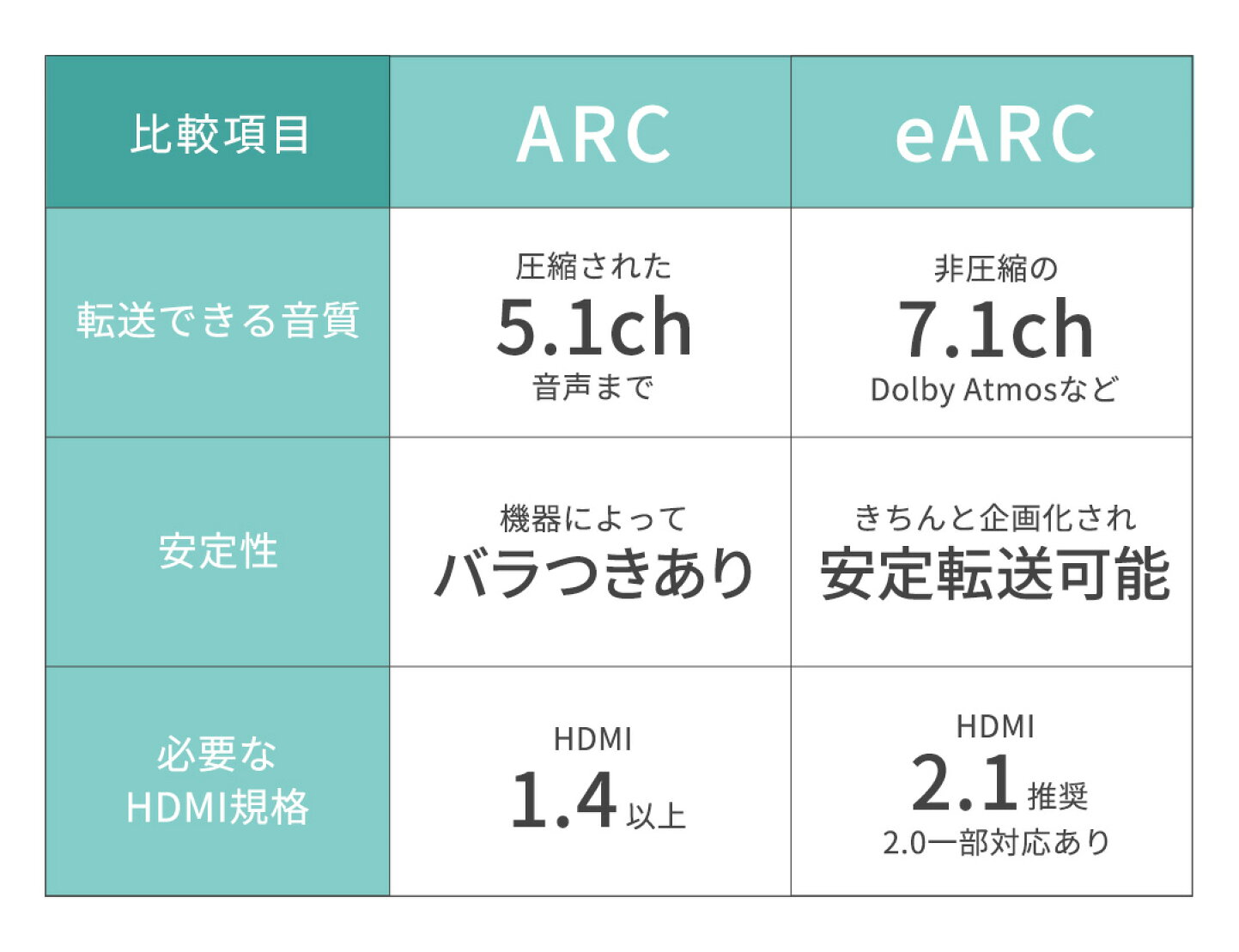 • 高音質音声(Dolby Atmos等)をテレビから受け取る「eARC」に対応していること。
