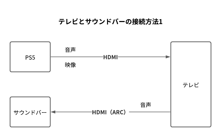 3. 接続:PS5は「テレビ」に、テレビ(eARC)は「サウンドバー」に繋ぐ。