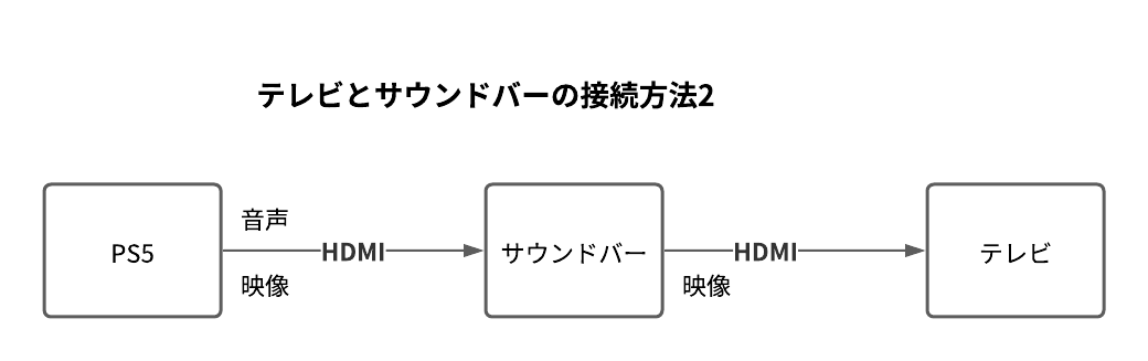 これは「サウンドバーにPS5を繋ぎ、映像と音声を一度サウンドバーで受けてから、映像だけをテレビに送る(パススルーする)」という考え方です。一見、合理的ですが、ここに巨大な罠があります。