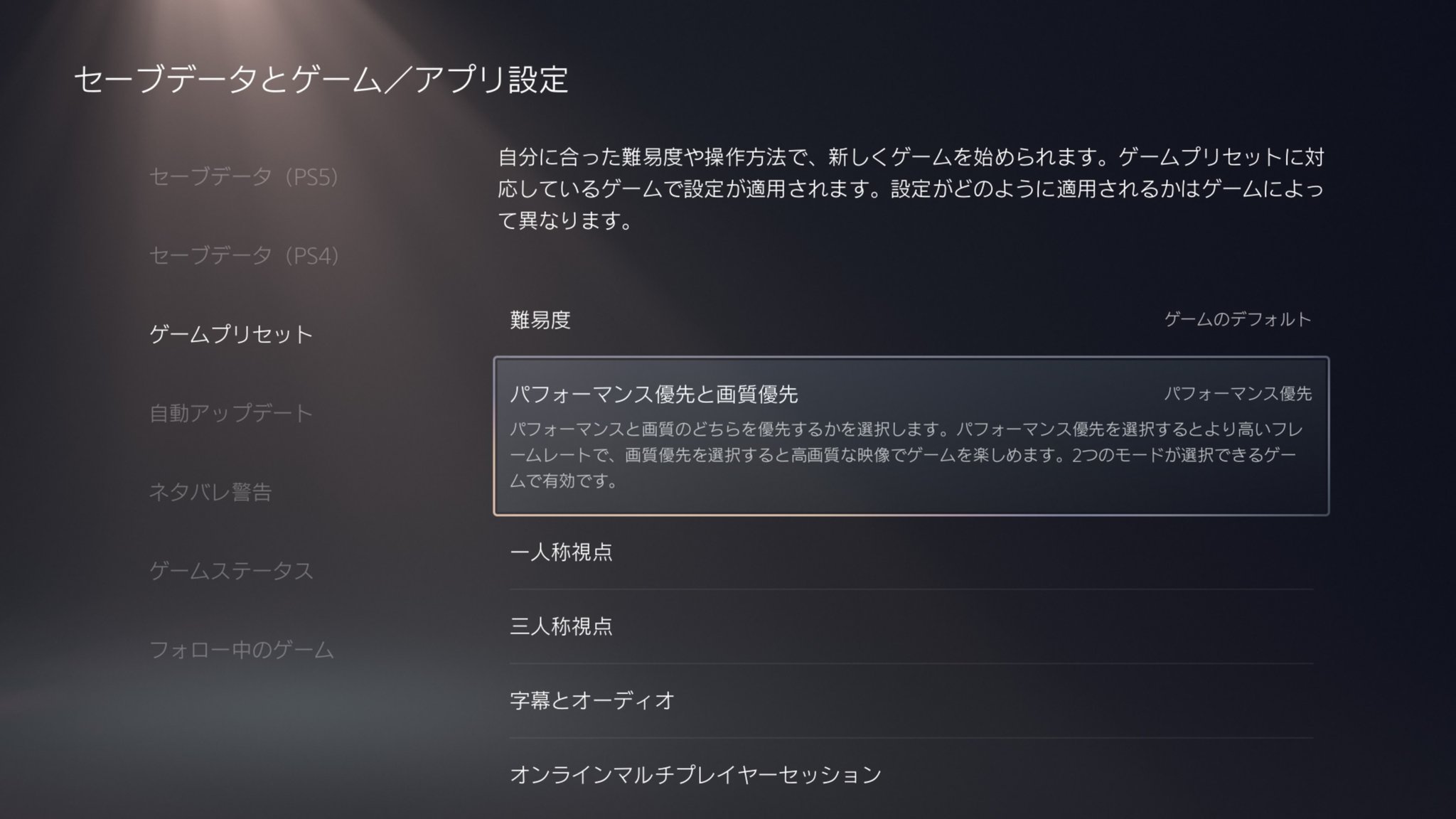 これは、「もしゲーム側に『画質モード』と『パフォーマンス(fps)モード』の選択肢があったら、自動的に『パフォーマンスモード』を選んでください」というPS5本体への“事前指示”です。