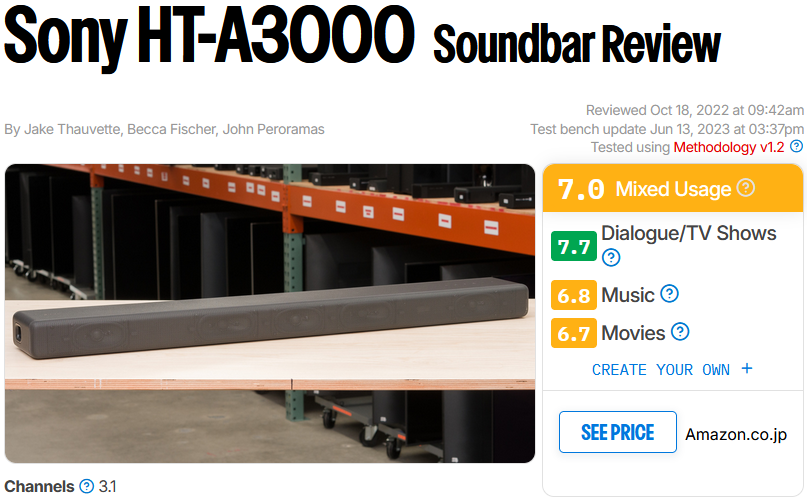 評価項目 Sonos Beam (Gen 2) SONY HT-A3000 勝者 総合 (Mixed Usage) 7.4 / 10 7.0 / 10 Sonos 映画 (Movies) 7.2 / 10 6.7 / 10 Sonos 音楽 (Music) 7.5 / 10 6.8 / 10 Sonos テレビ/セリフ (Dialogue/TV) 7.5 / 10 7.7 / 10 SONY 引用元:
