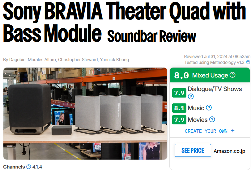 評価項目 単体 完成形 (HT-A9M2 + SA-SW5) スコア差 Mixed Usage (総合) 7.4 8.0 +0.6 Dialogue (会話) 7.4 7.9 +0.5 Music (音楽) 7.6 8.1 +0.5 Movies (映画) 7.3 7.9 +0.5 出典:RTINGS.com |Sony BRAVIA Theater Quad Soundbar Review