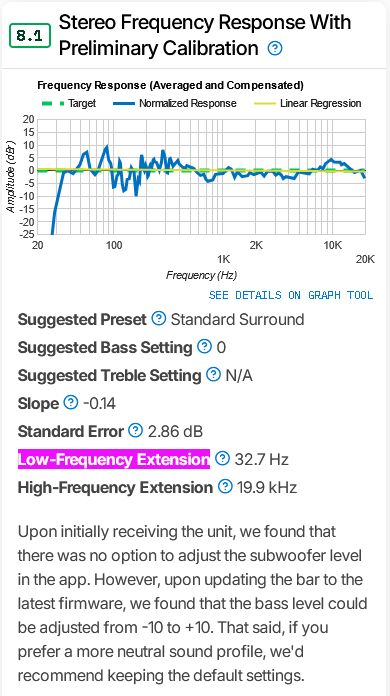 RTINGS.comは、サブウーファーを追加した状態(with Bass Module)でもテストを行っています。その結果を見てみましょう。