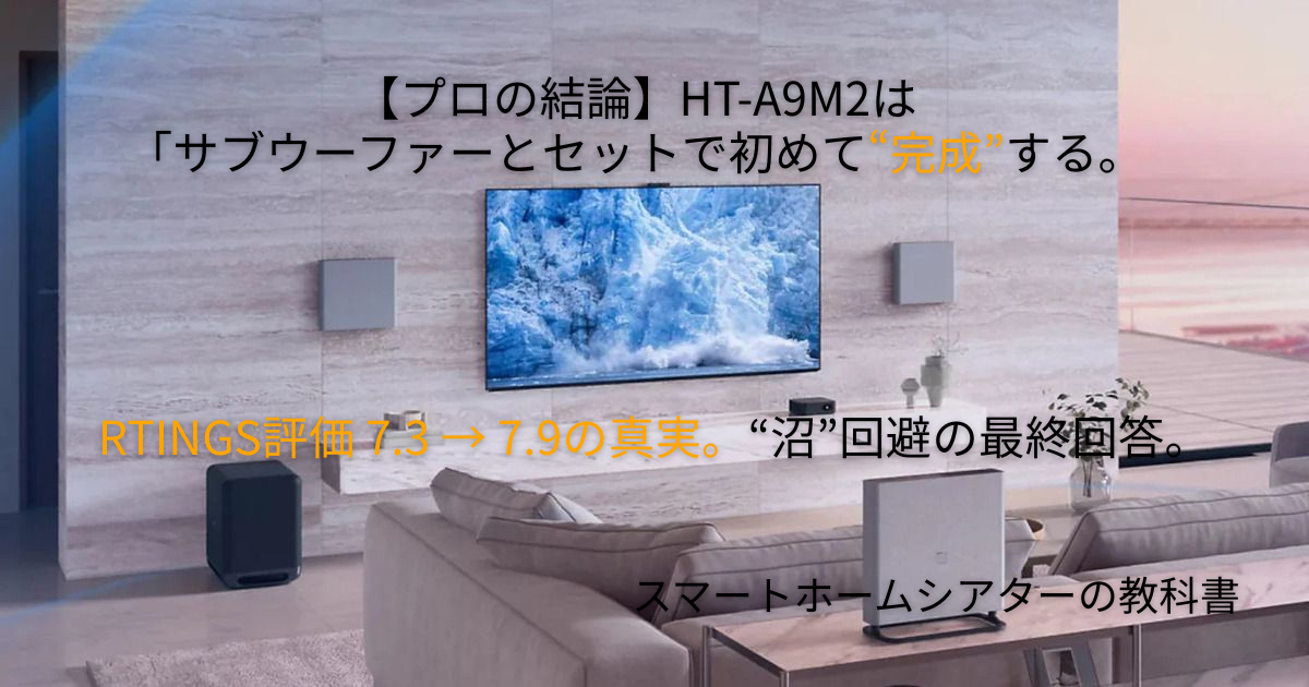 単体(RTINGS映画評価 7.3)と完成形(映画評価 7.9)は、データが示す通り、まったくの別物です。HT-A9M2単体の詳細な分析はこちら