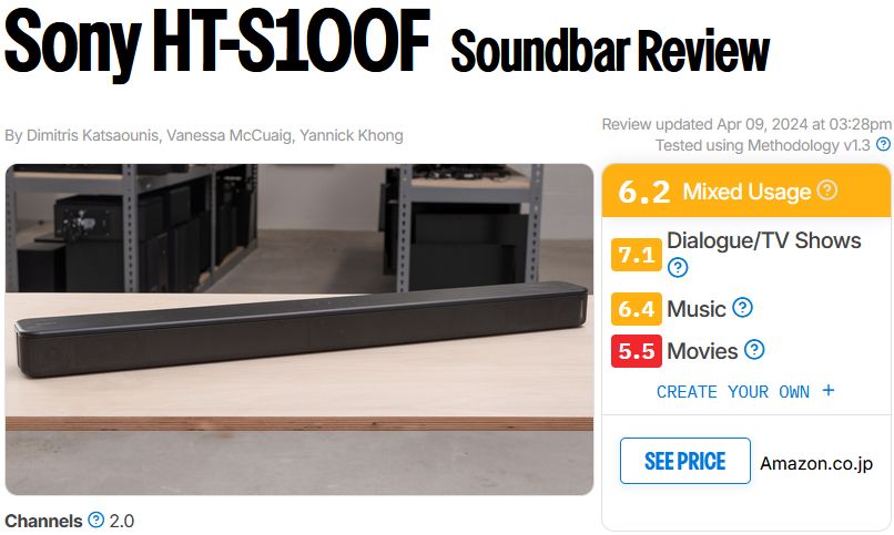 出典:RTINGS.com | Sony HT-S100F  Soundbar Review