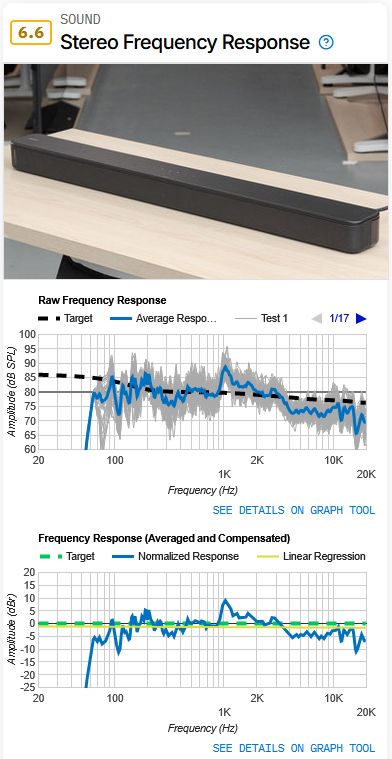 Movies スコアは「5.5」です。5点を超えてはいますが、7点台(Sonos Beam)と比べると大きな差があります。なぜこの差が生まれるのか。理由は「周波数特性(Frequency Response)」グラフに明確に出ています。