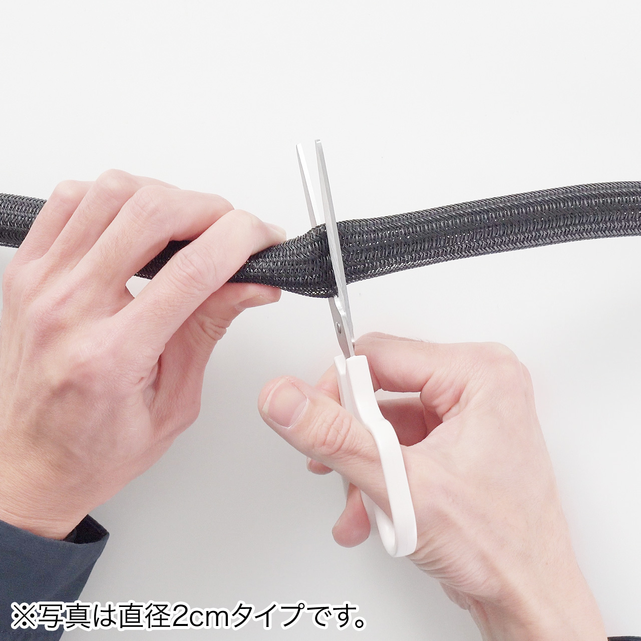 - 長さは5mと非常に長く、必要な長さでハサミでカットして使えます。また、メッシュ素材の隙間から、好きな位置でケーブルを外に出す(分岐させる)ことも自在です。